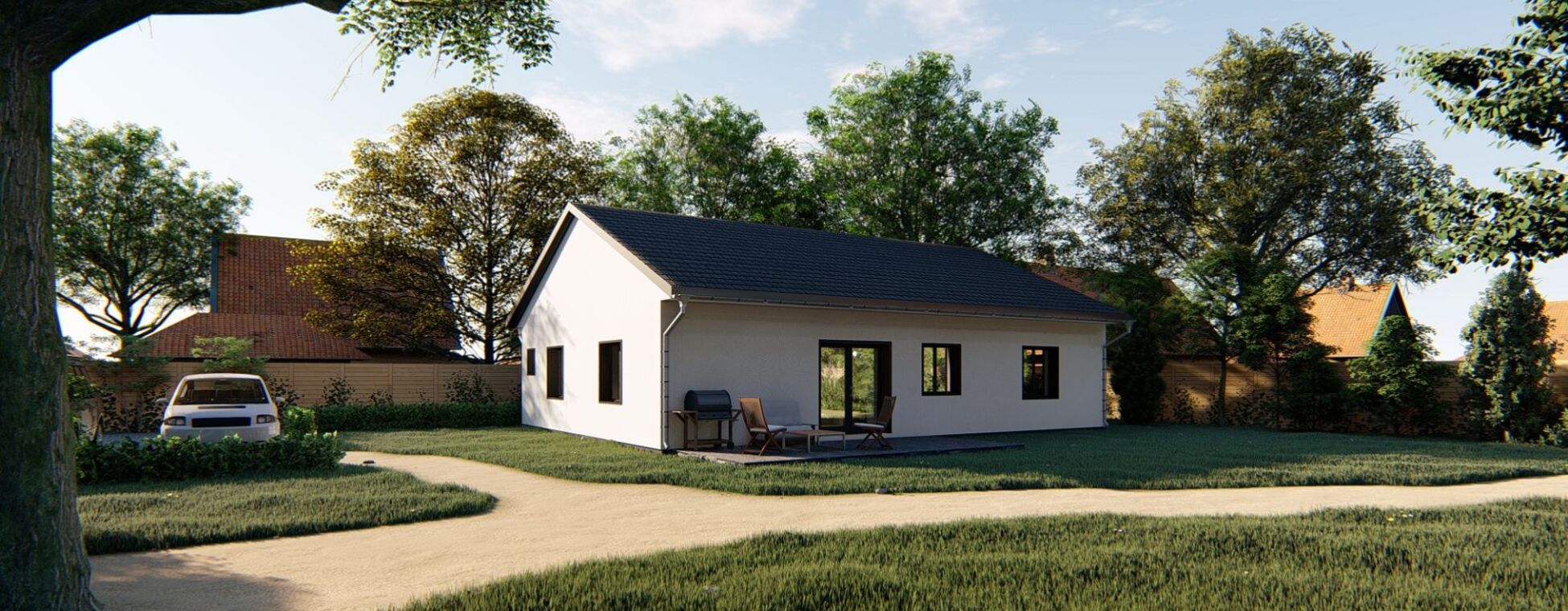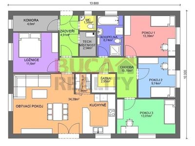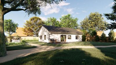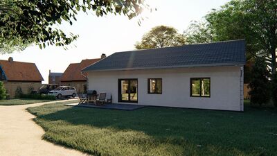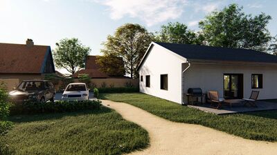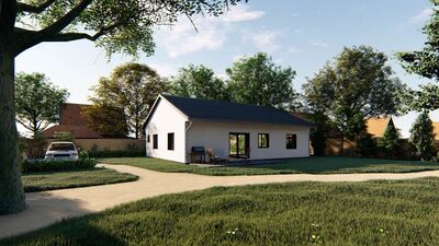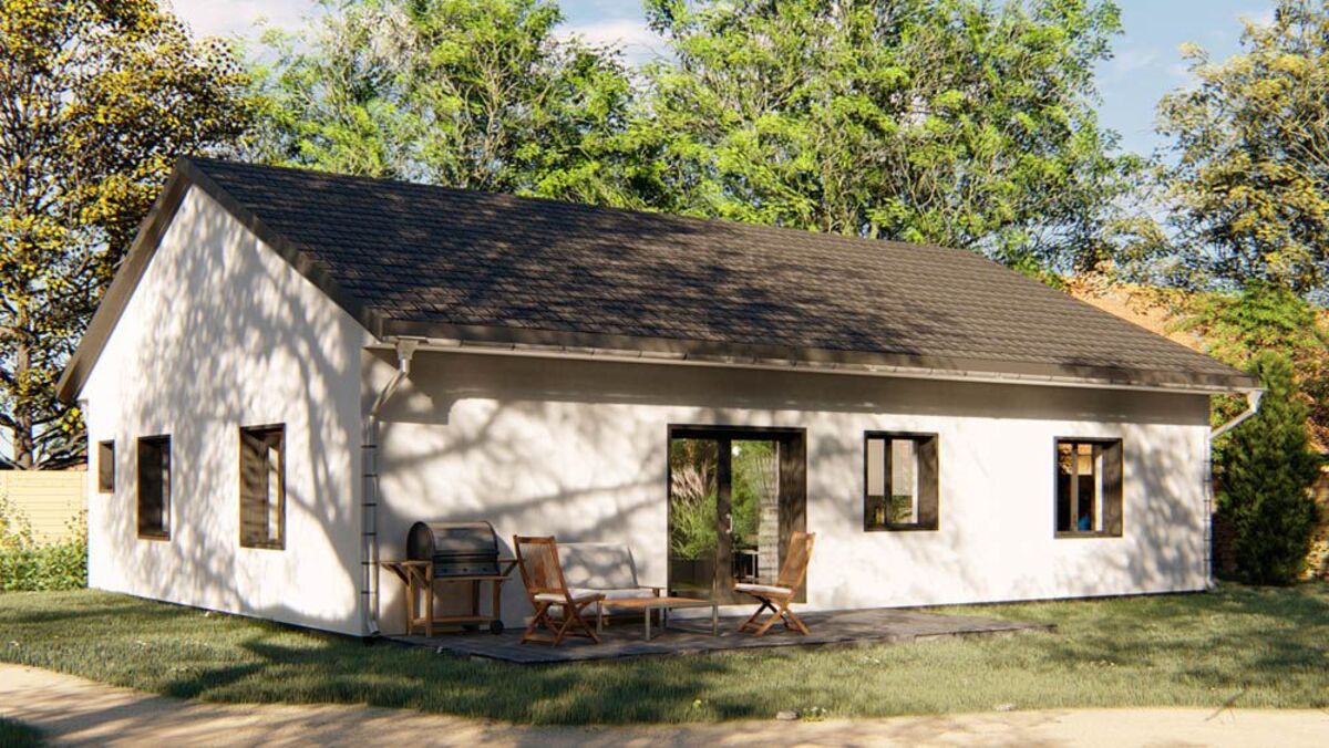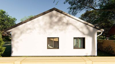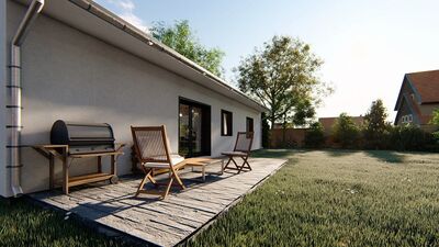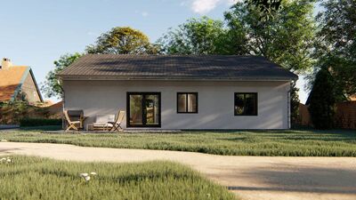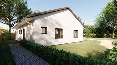 Jedná se o nízkoenergetický zděný bungalov o zastavěné ploše 143 m2, stavěný z kvalitních materiálů. Při konstrukci domu je kladen důraz na kvalitu, dlouhou životnost stavby a energetické úspory. Cihelné zdivo Porotherm, kvalitní okna s trojsklem, podlahové vytápění, záruka na konstrukce. Dům je na pozemku umístěn tak, aby měli obyvatelé dostatek slunce během celého dne a je dispozičně řešen jako 5+KK s možností klientských změn dispozice. Součástí domu při předání jsou podlahové krytiny, vybavení koupelen, obložky, dveře, vše možné vybrat dle přání klienta včetně barvy fasády. Bude provedeno oplocení pozemku, vydlážděné chodníky a parkovací stání pro 2 osobní automobily. V ceně je nová fotovoltaická elektrárna na střeše domu s ukládáním přebytků energie do vody. V základní variantě není zahrnuto jen osázení zahrady, kuchyňská linka a osvětlovací tělesa. Výstavba domu zahájena, dokončení plánováno na červen 2019. Dům si můžete zarezervovat složením 250 tis Kč a doplatit po dokončení. Na nemovitost zajistíme vhodné financování. ExteriérInteriérVše